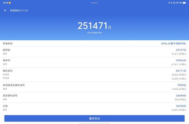 存储性能方面,还是使用《安兔兔评测》进行测试,得到 251471 分的成绩,其中顺序读的速度为 4141.5 MB/s,顺序写的速度为 4161.1MB/s,随机读写的速度分别为 2566.9MB/s 和2248.1MB/s。都是旗舰机型应有的性能表现。
