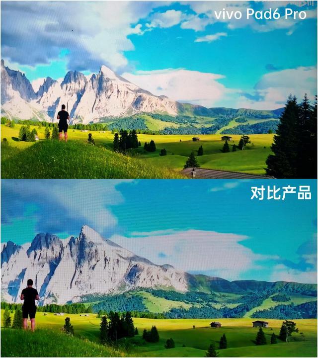 整体来说,第五代骁龙 8 至尊版平台加持的 vivo Pad6 Pro 在性能上显示是不用担心的了,虽然整体性能释放的策略还是稍偏保守地,但目前主流的大型游戏也都能比较轻松地应对,日常使用地性能需求更是不在话下。三、其他功能体验除了顶尖的性能,这次 vivo Pad6 Pro 的另一大看点就是 13.2 英寸 4K 原彩屏背后的观影和创作体验。具体来说,vivo Pad6 Pro 在 13.2 英寸大屏上实现了 4K 超高分辨率与 144Hz 高刷新率的融合,通过一系列全链路技术突破,让 4K 画质得以稳定、纯粹地呈现。实际测试时,IT之家使用 vivo Pad6 Pro 播放 4K 分辨率的 HDR 片源,并将其和另一款 1080P 分辨率(播放时片源也是 4K 清晰度)的 vivo 平板进行对比。以下面这一帧的画面来说,可以看到,右侧 vivo Pad6 Pro 呈现的画面明显比左侧对比产品更加细腻,同时 vivo Pad6 Pro 支持 HDR10 的画面显示,可以明显看到,在远处天空高光的部分,vivo Pad6 Pro 显示的天空细节层次明显比对比产品更加丰富,对比产品的远处天空高光有些亮成一片了。