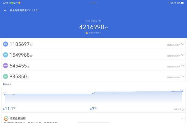 同时,IT之家拿到的这款 vivo Pad6 Pro 搭载 16GB LPDDR5X 内存和 512GB 的 UFS 4.1 存储,都是当前顶级性能的铁三角配置。具体性能方面,IT之家使用《安兔兔评测 V11》进行测试,得到综合成绩为 4216900 分,其中 CPU 得分为 1185697 分,GPU 成绩为 1549988 分。