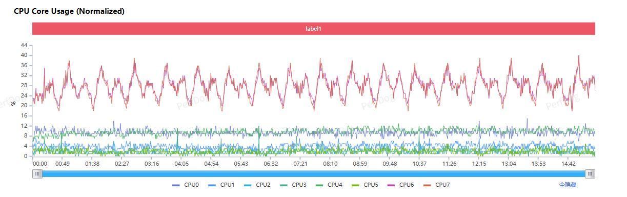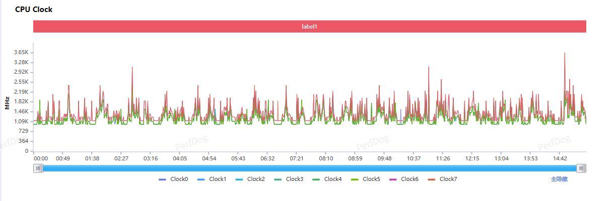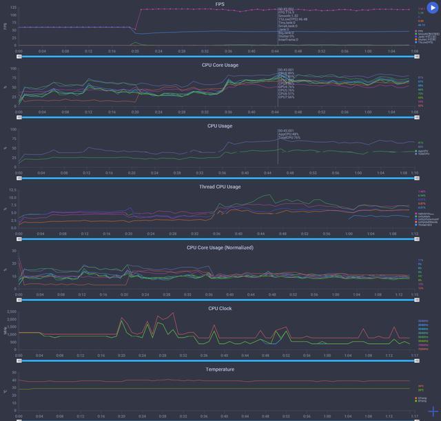 观察 CPU 核心的调度情况,可以看到游戏过程中主要是 2 枚最高主频 4.6GHz 的超大核心在持续发力,整体 CPU 频率大约在 1 GHz-2GHz 上下波动,超大核偶尔会冲高到 3.0GHz 以上然后迅速回落,8 枚核心的性能调度还是比较合理的,同时可以看到第五代骁龙 8 至尊版也没有发挥全力。