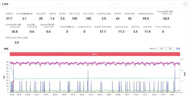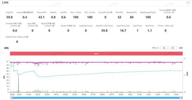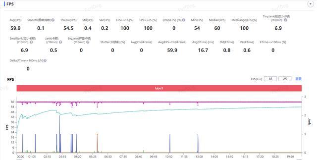 然后我们使用性能要求更高一些的《原神》进行测试,测试时画质选项都调到最高,然后在游戏中的枫丹廷进行 20 分钟的跑图。全程测试下来也是轻松应对,平均帧率达到 59.9 FPS,帧率曲线也基本是一条直线,实际游戏体验感受也是感觉不到帧数的波动。