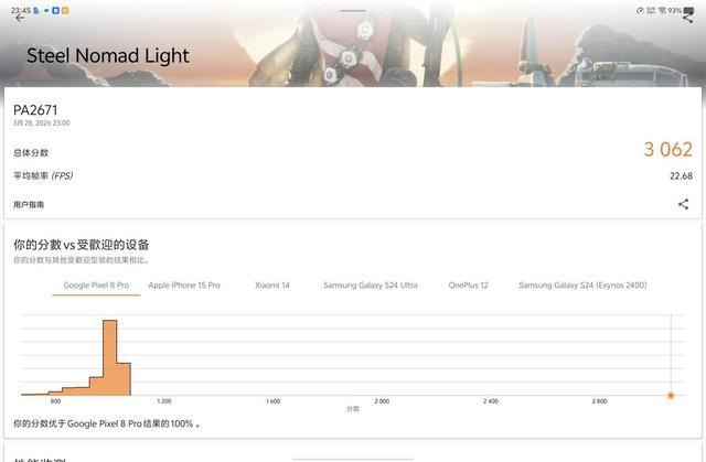 在 GPU 性能方面,IT之家还使用《3D Mark》测试了 Steel Nomad Light 项目,得到综合分数为 3062 分,平均帧率为 22.68 FPS。