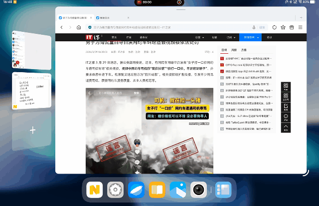 除了 4K 视频的拍摄、观看和创作,对于普通工作者来说,现在也可以用 vivo Pad6 Pro 处理一些基本的工作内容了。首先要说的就是 vivo Pad6 Pro 的原子工作台,类似于 iPad OS 的台前调度,在 vivo Pad6 Pro 上,从屏幕右下角往中间划动悬停,就可以呼出原子工作台。开启后,支持至多 5 个应用窗口同屏显示,且互不遮挡。你可以关注多个应用进程,并通过主窗口和原子窗形态在其间快捷切换。