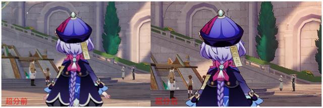 而接下来这两张图则展示了游戏超分开启前后,游戏画质的变化,可以看到,开启游戏超分后,《原神》的游戏画质确实更加清晰锐利了,画面清晰度有肉眼可见的提升,细节也更加丰富了,比如角色人物身上的纹理,明显更加清晰。