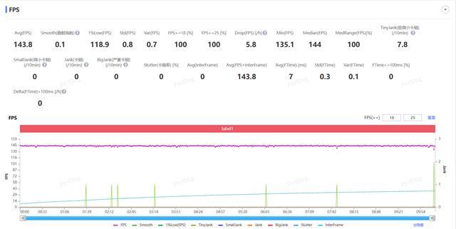 下面我们再来看 vivo Pad6 Pro 在实际游戏场景中的性能表现。首先是IT之家用《王者荣耀》进行测试,测试时将游戏画质选项调到最高,平板设为性能模式。结果不出意外,面对《王者荣耀》这样的游戏,vivo Pad6 Pro 能够以 143.8 FPS 的帧率平稳运行,全程帧率曲线几乎没什么波动,就像一条直线,游玩体验自然也是丝滑流畅的。