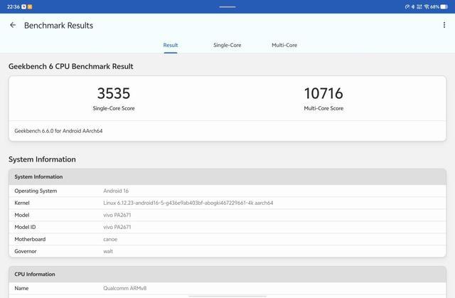 使用 GeekBench 6 测得单核成绩为 3535 分,多核成绩为 10716 分。