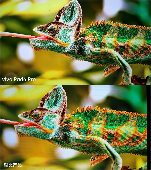 下面这一帧画面靠近来看,4K 原彩屏的 vivo Pad6 Pro 在显示蜥蜴身上密布的鳞片时,也能将密密麻麻的鳞片纹理细节更加精细锐利,几乎每一条纹理都能看见。而对比产品虽然乍一看也不错,但仔细看,特别是在身上的鳞片,有一些部分直接和颜色糊在了一起,看起来就没有那么细腻了。